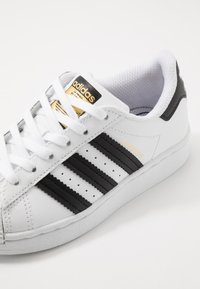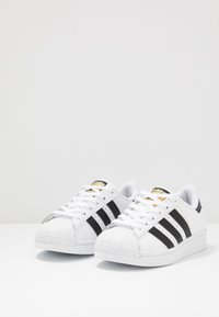 S košarkarskega igrišča v učilnico. Vsak otrok si zasluži par čevljev adidas Superstars. Ti otroški čevlji praznujejo 50 let klasične zasnove z značilno školjčno konico. Od prepoznavnih nazobčanih 3 črt do udobnega gumijastega podplata, ta jubilejna izdaja počasti ikono. Ne glede na to, ali so popolnoma beli, popolnoma črni ali nekaj vmes, ti čevlji poskrbijo za svež videz pri najmlajših.