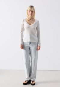 Belo dolgo rokavno majico z globokim V-izrezom, lahkotno bombažno tkanino, gladko teksturo, kombinirano z modrimi hlačami z detajli logotipa.