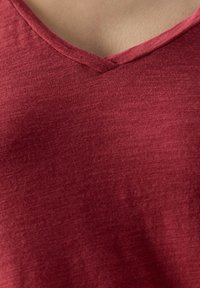 Mlada ženska s svetlo blond lasmi, oblečena v ohlapno rdečo majico z dolgimi rokavi in V-izrezom ter svetlo modre kavbojke, stoji pred enobarvnim ozadjem.
