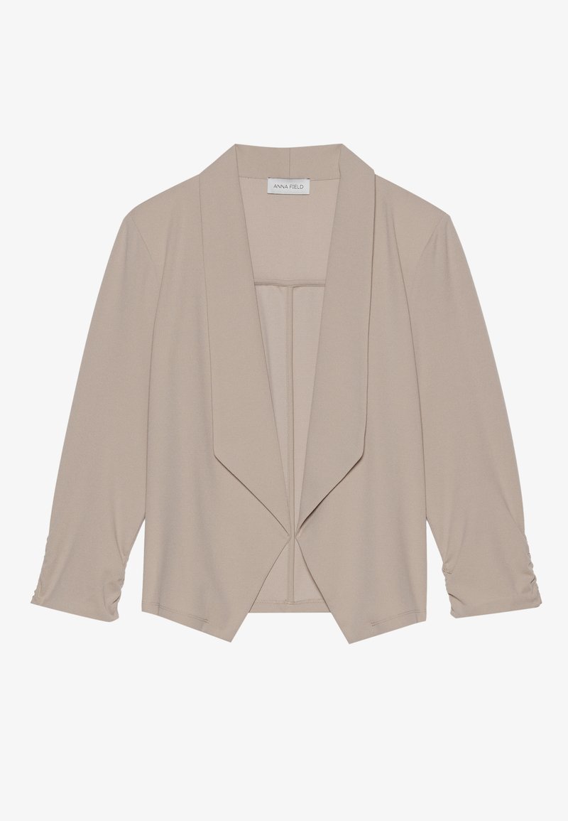 Bež jakna iz lahkega materiala z drapiranim sprednjim delom, rokavi do tri četrtine in nabranimi manšetami. Mehka tkanina z gladko teksturo in brez zapenjal.