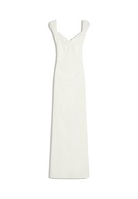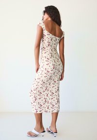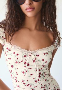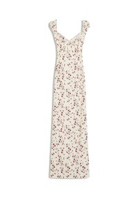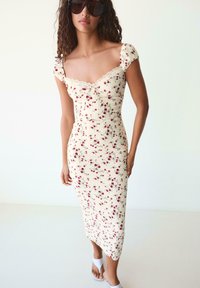 Ženska v oprijeti midi obleki v kremno beli barvi z rdečim cvetličnim potiskom, kratkimi napihnjenimi rokavi, sprednjo zavezo, velikimi temnimi sončnimi očali in belimi sandali.