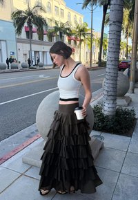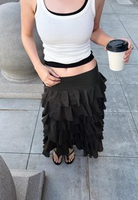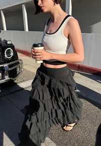 Oseba, oblečena v belo brezrokavnik in večplastno črno krilo, drži skodelico kave za s seboj in stoji na tlakovanem robu na prostem.