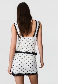 Mlajša ženska z dolgimi rjavimi lasmi, oblečena v belo obleko brez rokavov s črnimi pikami in črnim čipkastim robom, stoji z roko na boku.