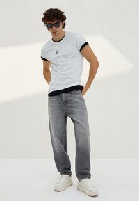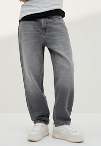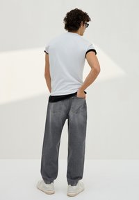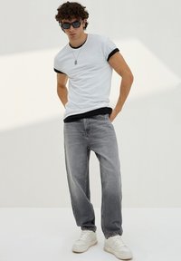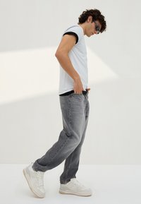 Moški, oblečen v ohlapne sive kavbojke iz jeansa in bele superge, na enostavni svetli podlagi.
