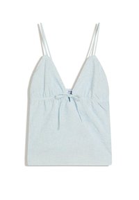 Mlada ženska v roza črtasti brezrokavnik in svetlo modrih kavbojkah z belimi in temnimi zapestnicami, stoji pred enobarvnim ozadjem.