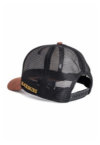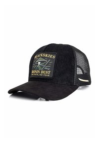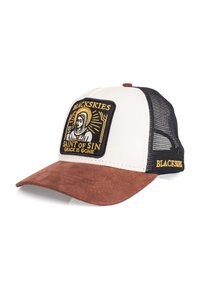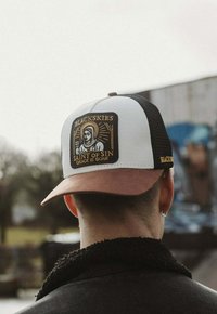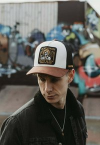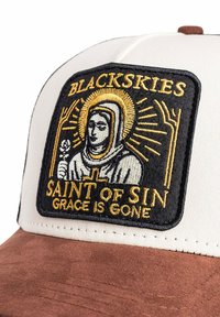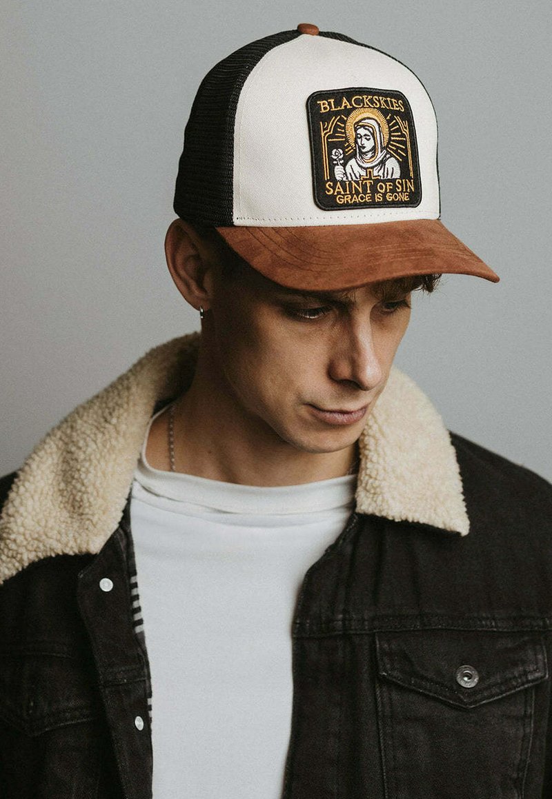 Mladenič z črno-belo tovornjakarsko kapo z rjavim šiltom in izvezeno značko z napisom "BLACKSKIES Saint of Sin Grace is Gone."