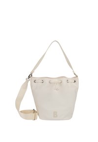 Črna nylon torbica z vrvico za zapiranje, srebrno kovinsko opremo in odstranljivim trakom. Na sprednji strani ima vtisnjen logotip "B".