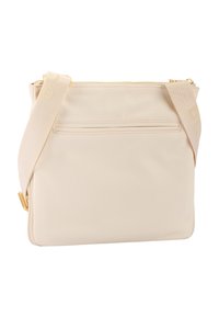 Bež nylon torba z zlatimi kovinskimi dodatki, z zadrgo, zgornjim ročajem in detajlom z logotipom. Gladek tekstura s sodobno, pravokotno obliko in sprednjim žepom.