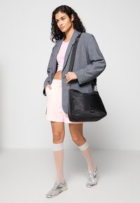 Črna najlon torba na ramo z nastavljivim trakom; ima gladko teksturo in majhno logotip; nosi jo oseba v sivi blazerki in roza kratkih hlačah.