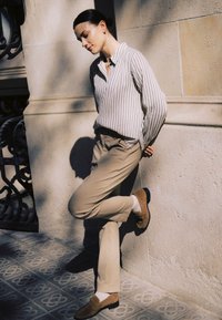 Bež hlače z ravnim krojem, sprednjimi žepi in subtilnimi šivi, v kombinaciji s temno rjavimi koničastimi petkami.
