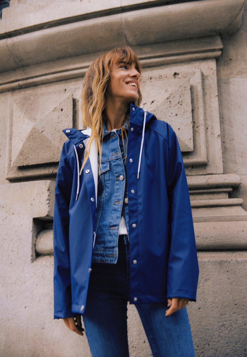 Modra vodootporna dežna jakna s kapuco, z gumbi na pritisek in žepi. Ima gladko teksturo in sproščen kroj, kar jo naredi idealno za slabo vreme.