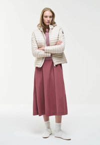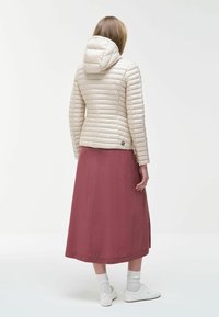 Ženska, oblečena v svetlo bež prešito jakno s kapuco in zadrgo spredaj ter bordo krilo, stoji z eno roko v žepu.