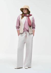 Ženska, ki nosi bež klobuk vedro, kremasto vatirano brezrokavnik in roza majico z dolgimi rokavi, roki v žepih brezrokavnika, na belem ozadju.