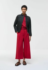 Ženska s kratkimi kodrastimi lasmi, oblečena v črno prešito jakno z zadrgo in rdeče hlače, gleda v stran z rokami v žepih.