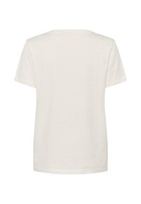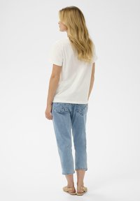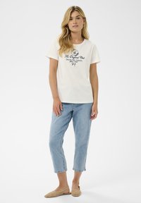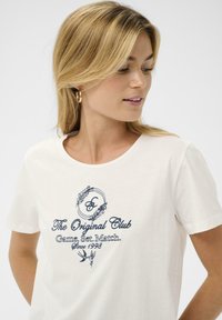 Bela bombažna majica z okroglim izrezom, kratkimi rokavi in mornarsko modrimi grafikami, ki prikazujejo napisa "The Original Club" ter dekorativne elemente.