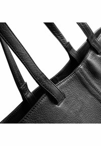 Ženska, oblečena v belo srajco in črne hlače, nosi veliko črno usnjeno torbo čez ramo na sivi podlagi.