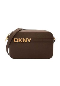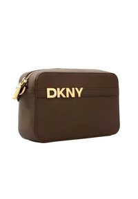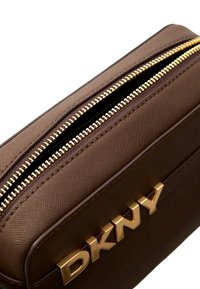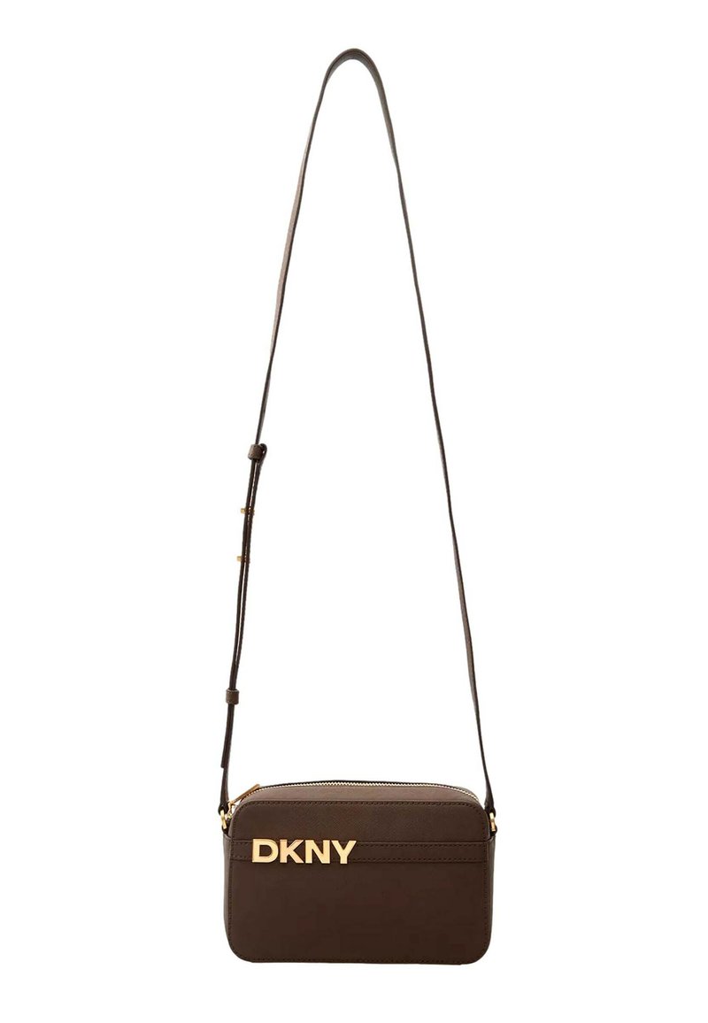 Rjava torbica čez ramo iz hrapavega usnja ima zadrgo, nastavljiv trak in zlate logotip "DKNY" spredaj. Gladek otip.