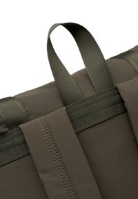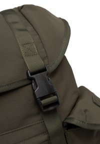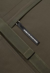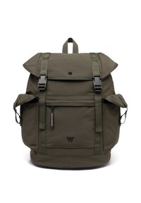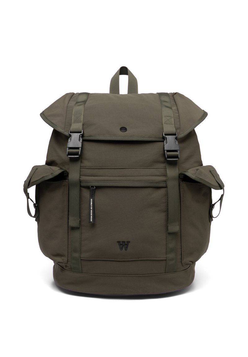 Temno zelena nahrbtnik z zanko in zaponkami, sprednji žep z zadrgo, dva stranska žepa, zgornji ročaj in logotip "W" na sprednji plošči.