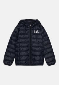 Temno modra puffer jakna s kapuco, z zadrgo, rebrastimi manšeti in vodoravno šivano teksturo. Na prsih je bel logotip EA7.