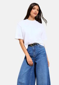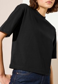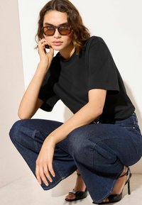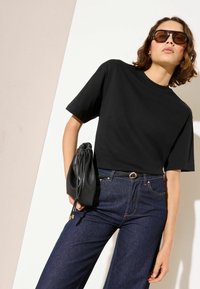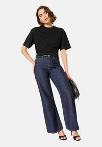 Črna majica s kratkimi rokavi v kombinaciji z visokim pasom temno modrih širokih hlač. Črne sandale s peto in črna torbica dopolnjujejo videz.