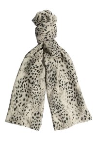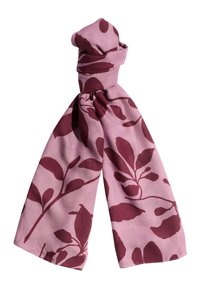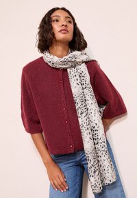 Ženska s kodrastimi lasmi, oblečena v rdeč gumbast pulover, belo-črni šal z lisami in modre kavbojke, stoji ob svetlem zidu.