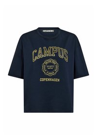 Bela bombažna majica s sproščenim krojem, kratkimi rokavi, okroglim izrezom in grafičnim tiskom "CAMPUS COPENHAGEN" v sivi barvi na sprednji strani.