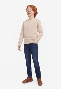 Rdečelas deček se smeji, oblečen v bež jopa, temno modre kavbojke in rjave superge, stoji z eno roko v žepu.