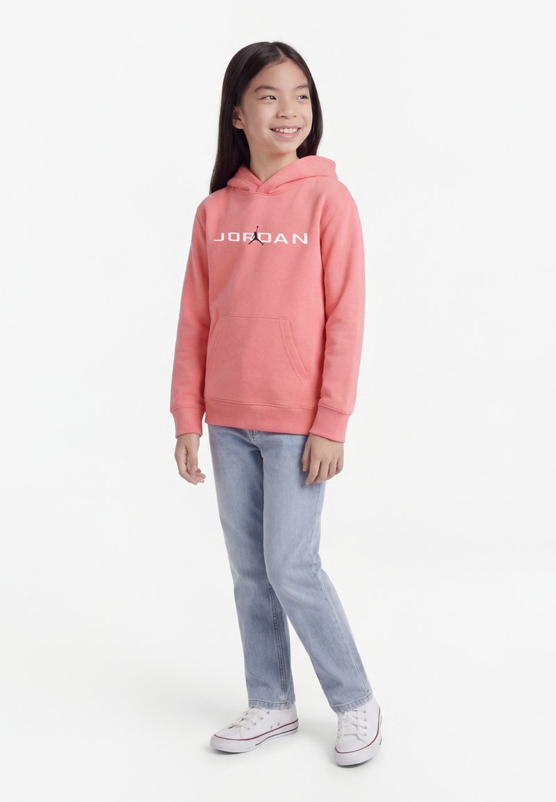 Nasmejana deklica, oblečena v koralno kapuco Jordan, svetlo modre kavbojke in bele superge, stoji in gleda v stran na belem ozadju.