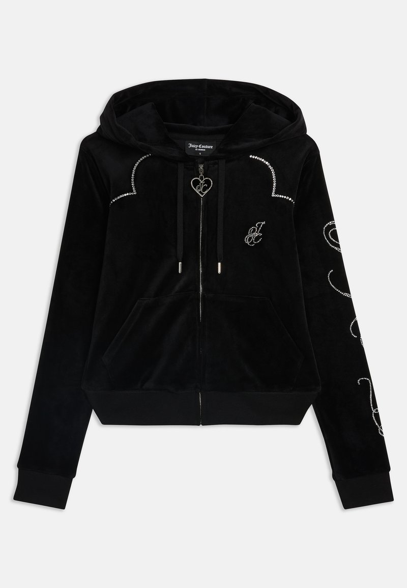 Črna žametna zip up kapuca z podloženim kapuco, sprednjimi žepi, okrašena z rhinestones in srčnim obeskom na zadrgi.