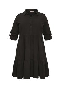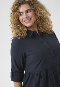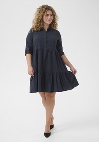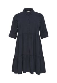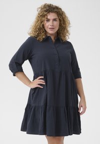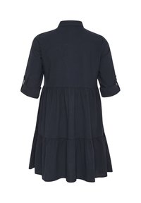 Mornarsko modra obleka z gumbom spredaj, rokavi do tri četrtine in večplastno krilo. Narejena iz lahkega materiala z sproščenim krojem.