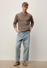 Mladi moški stoji z rokami v žepih, oblečen v rjavo pulover z V-izrezom, svetlo modre sproščene hlače iz jeansa in rjave športne copate na enobarvnem ozadju.
