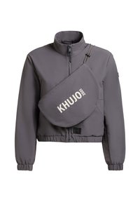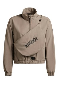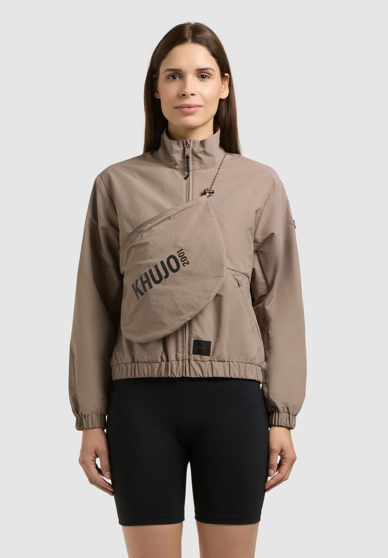 Ženska v bež jopiči z zadrgo in torbico čez ramo z napisom "KHUJO", oblečena v črne kolesarske kratke hlače, stoji pred enobarvnim ozadjem.