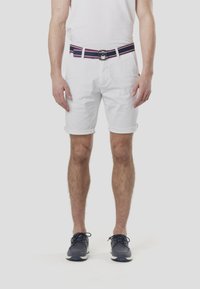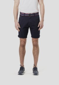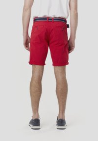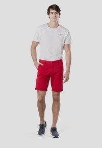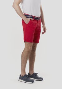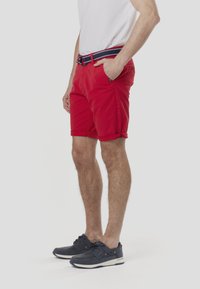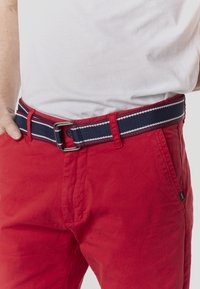 Rdeče bombažne kratke hlače z zavihanim robom, opremljene z mornarsko modro in belo črtasto pasu. Opravljene s temnimi čevlji in belo majico s kratkimi rokavi.