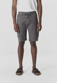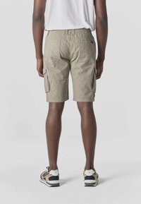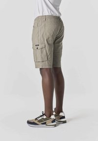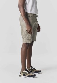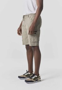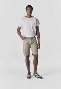 Moški, ki nosi bež cargo hlače, belo majico in zelene, črne ter bež superge, stoji na nevtralnem ozadju.