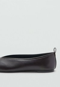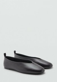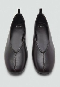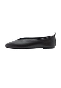 Črni balerinki z usnjenim zgornjim delom, zaobljenim sprednjim delom, elegantnim dizajnom, tankim podplatom in majhno zanko na zadnjem delu za lažjo obutje. Gladek tekstura povsod.