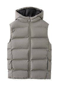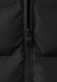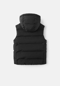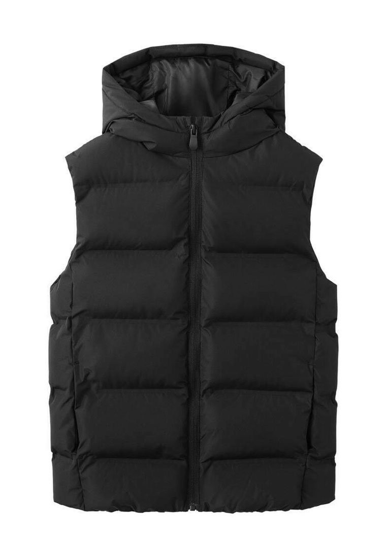 Črna puhovka brez rokavov s kapuco, opremljena s sprednjim zadrgo, prešita z vzorcem pravokotnih odsekov in s gladkim, mat zaključkom.