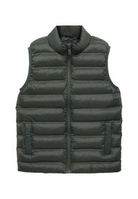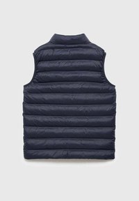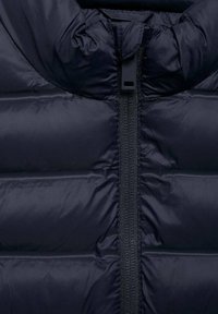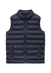 Temno modra brezrokavna puhasta jopica z vodoravnimi šivi, pokončnim ovratnikom, sprednjim zadrgo in dvema stranskima žepoma.
