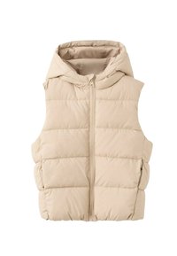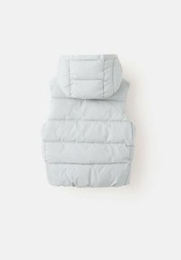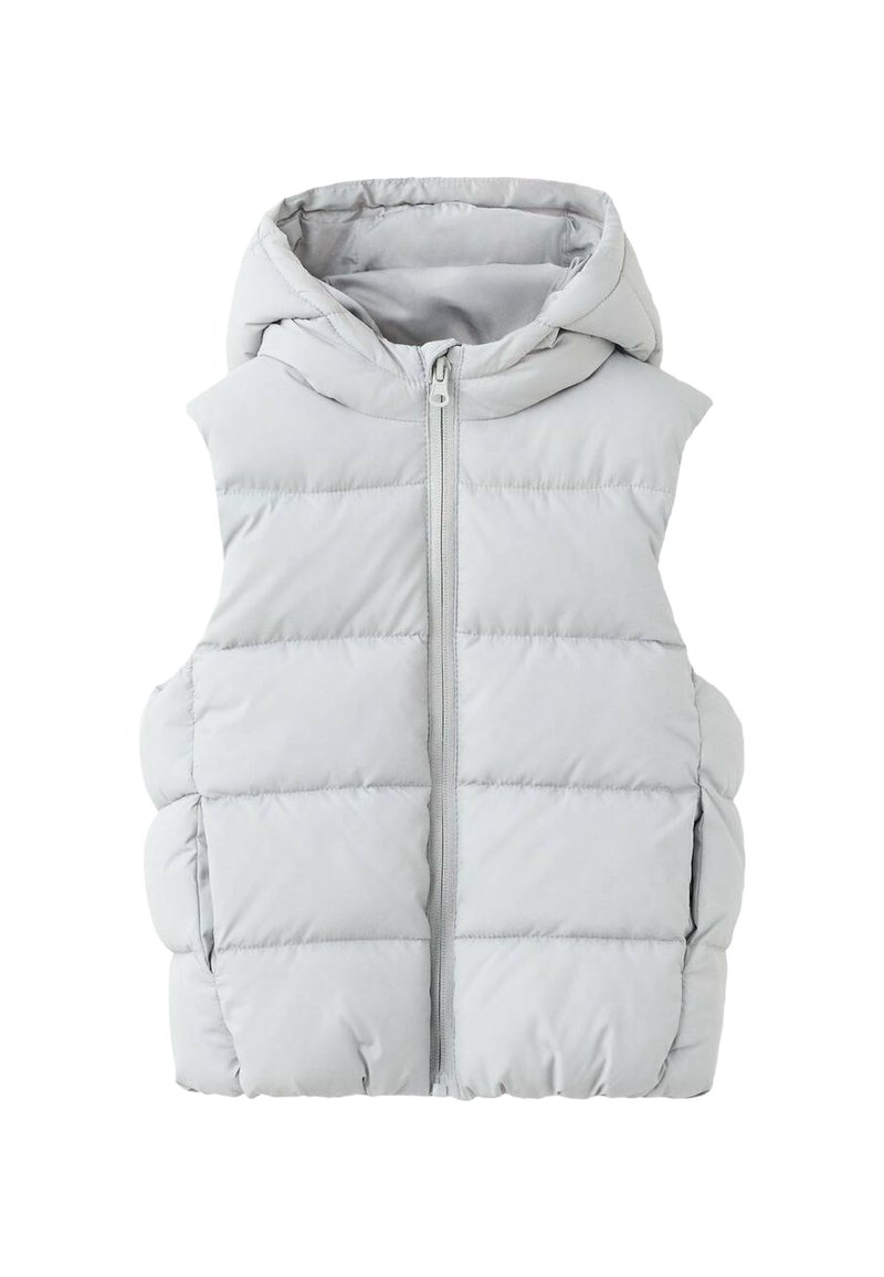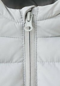 Svetlo siva puhasta telovnik s kapuco, z vodoravnim prešitim vzorcem, z zadrgo po celotni sprednji strani in stranskimi žepi. Mehka, gladka tekstura.