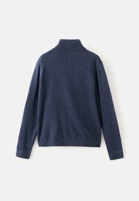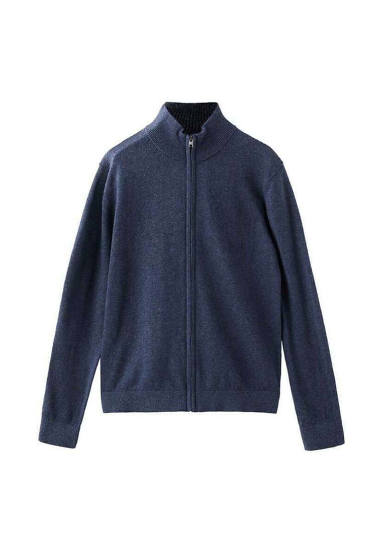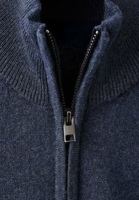 Temno modra jopica z zadrgo in visokim ovratnikom, izdelana iz teksturirane tkanine. Ima dolge rokave in rebrast zaključek na pasu ter manšetah.