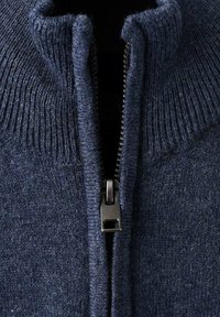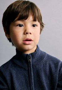 Temno modra jopica z zadrgo čez belo srajco, kaki hlače s žepi in temno modri športni copati z belimi poudarki; sproščen otroški outfit.