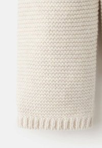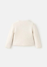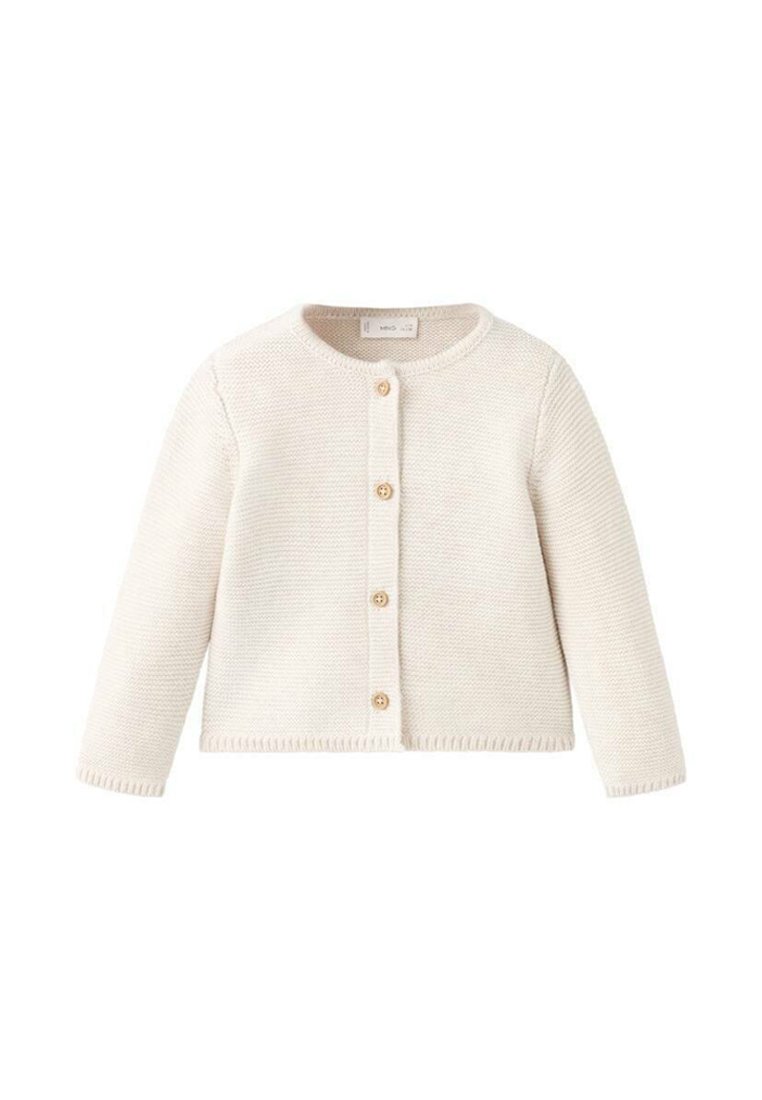 Kremasti kardigan s teksturirano pletenim vzorcem, okroglim izrezom in petimi lesenimi gumbi spredaj. Dolgi rokavi z rebrastimi zaključki.