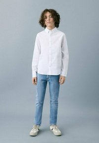 Bela srajca z dolgimi rokavi in ovratnikom, svetlo modre kavbojke in bež superge z modrimi poudarki. Gladek material in prilegajoč se kroj.