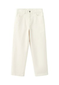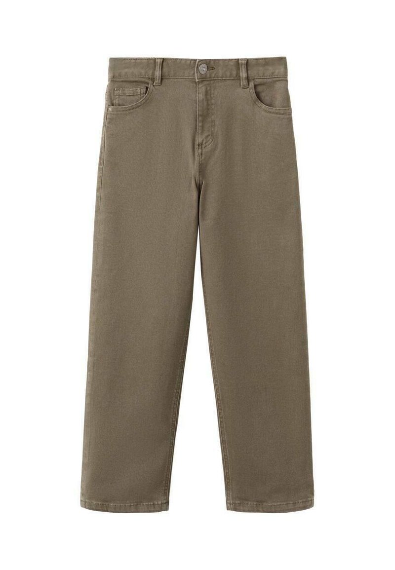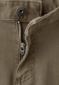 Hlače ravnega kroja barve kaki iz mešanice bombaža, z zaponko na gumbe, petimi žepi in gladkim otipom.