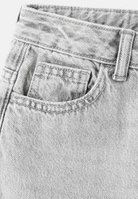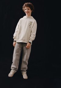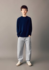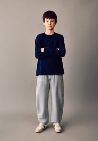 Najstniški fant stoji z rokami v žepih, oblečen v mornarsko modro majico z dolgimi rokavi, svetlo sive kavbojke in bele superge, na preprostem ozadju.