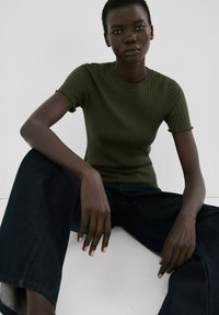 Ženska stoji z rokami na bokih, oblečena v oprijet top olivno zelene barve z rebrastim vzorcem in kratkimi rokavi ter široke temno modre kavbojke z ohlapnimi širokimi hlačnicami.