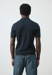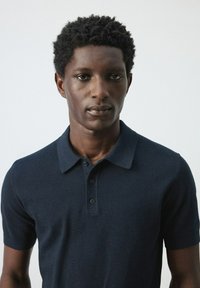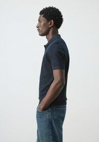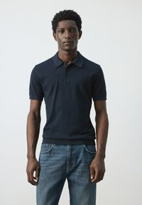 Mlad temnopolti moški stoji, oblečen v temnopolkasto polo majico s kratkimi rokavi in modre kavbojke na preprostem svetlem ozadju.