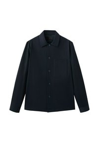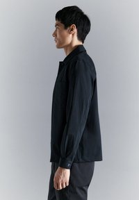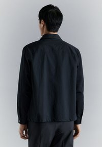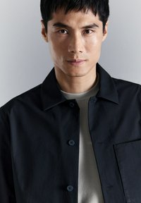 Moški v črni jakni na gumbe preko svetlo sive srajce, z črnimi hlačami, stoji pred enobarvnim sivim ozadjem.