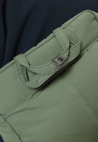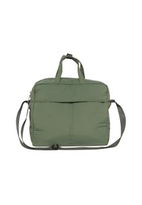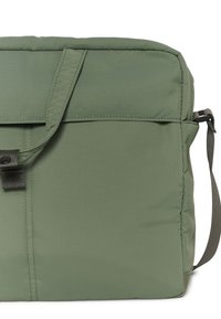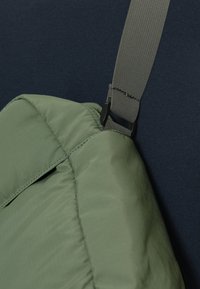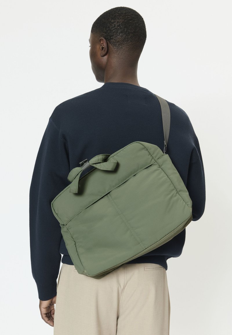 Moški v mornarsko modrem puloverju in bež hlačah nosi zeleno torbo čez ramo na belem ozadju.
