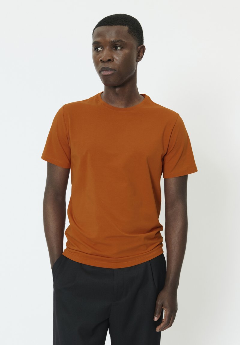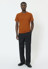 Majica s kratkimi rokavi v barvi bara, z okroglim izrezom, lahkimi tkaninami in gladko teksturo. Kombinirana s črnimi hlačami za kontrast.