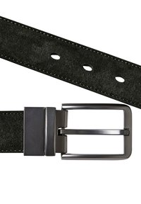 Črn suedin pas z rectangularno sivo-zanko; teksturirana površina brez vidnih vzorcev, gub ali okraskov.